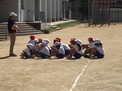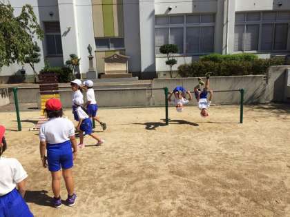 運動会が終わり、次は作品展の準備です。ですが、大きな行事が一つ終わり、特に今日はとても過ごしやすい気候で、天気も良く、ゆるやかに時間が流れている感じがします。子どもたちは元気です。1年生の体育の様子です。鉄棒逆上がりをした後、一輪車とドッジボールをしました。