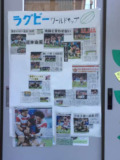 図書室補助員の先生が昨日来られました。図書室前の掲示を変えてくださいました。1週間の事柄ですので、ラグビーワールドカップです。新しく図書に入った本の連絡もしてくださっています。興味があれば読んでみてください。