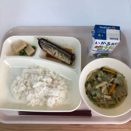 今日の献立は、ご飯、牛乳、さんまのさんしょう焼き、すまし汁、高野豆腐の煮物でした。