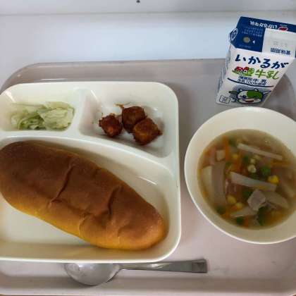 今日の献立は、パンプキンパン、牛乳、まぐろのオーロラ煮、ベーコンとジャガイモのスープ、キャベツのゆずドレッシングでした。