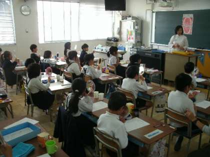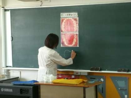 2・4・6年生は今日「歯の健康指導」がありました。2年生の様子です。永久歯など歯の構造を教えていただきました。丁寧な歯みがきの仕方を教わり、染料をつけて磨き残しを確認。実際に歯ブラシを使って、ゴシゴシ。赤く染まったところがだんだん白くなると、今までより丁寧に歯みがきをする決意をした2年生でした。
