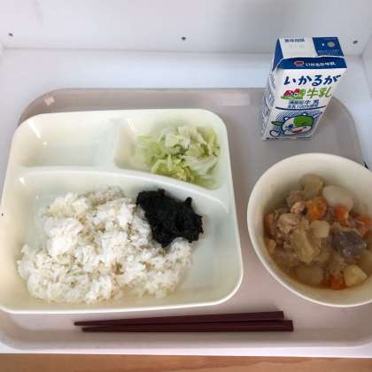 今日の献立は、ご飯、牛乳、関東煮、あっさりキャベツ、のりの佃煮でした。