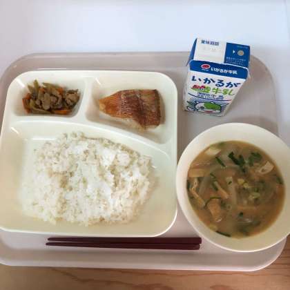 今日の献立は、ご飯、牛乳、赤魚のしょうゆだれかけ、みそ汁、きんぴらごぼうでした。