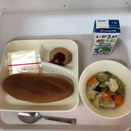 今日の献立は、黒糖パン、牛乳、豆腐ハンバーグ、カリフラワーのスープ煮、スライスチーズでした。