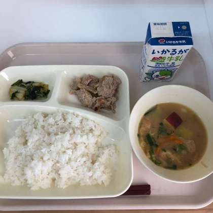 今日の献立は、ご飯、牛乳、豚肉のしょうが焼き、さつまいものみそ汁、きくなとはくさいのごまあえでした。