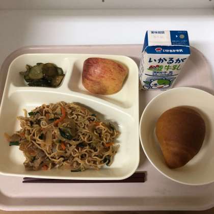 今日の献立は、黒糖パン、牛乳、オイスターソース焼きそば、きゅうりの中華あえ、りんごでした。