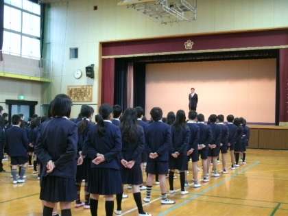 あけましておめでとうございます。3学期が始まりました。あっという間の冬休みでした。みんな、冬休みは平穏に過ごしたのかな、と思っています。久しぶりに見た顔は元気いっぱいです。始業式では校歌も元気よく歌いました。始業式が終わったら、「たてわり班」の次の学年への引継ぎが行われました。3学期はまとめの学期です。次の学年への準備もしていきましょう。