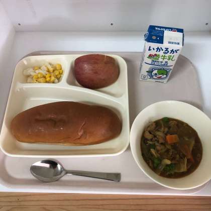今日の献立は、黒糖パン、牛乳、豚肉と野菜のカレー煮、カリフラワーとコーンのサラダ、りんごでした。