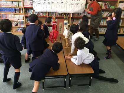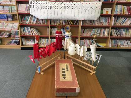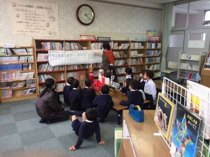 図書館補助員の方が、石川県金沢市でお正月によく行われる遊びを持ってきてくれました。「旗源平」というものです。源氏と平家に分かれて2つのサイコロを振り、出た目によって旗を取り合う遊びです。小旗10本、中旗5本、大旗1本を交互に取り合い、最後にまとい(陣営の旗)をとった方が勝ち、という遊びです。また、サイコロの目の出方に名前がついていて、声を掛ける言葉遊びも含まれています。例えば、5と1であれば「うめがいち」とチームで声をかけます。一番いい目が出るように、という意味合いが入っています。1年生が5時間目の図書の時間にやってみました。ルールが分かったら、大騒ぎです。大きな声を出して、いい目が出るようにチームで応援していました。色んな遊びがあることを学習しました。