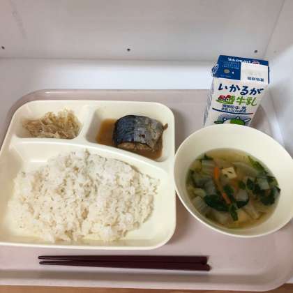 今日の献立は、ご飯、牛乳、さばのみそ煮、すまし汁、もやしのゆずの香あえでした。