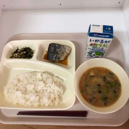 今日の献立は、ご飯、牛乳、さごしのしょうゆだれかけ、みそ汁、みずなの煮びたしでした。