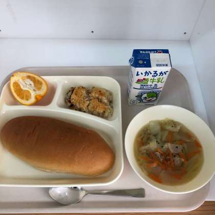 今日の献立は、黒糖パン、牛乳、押し麦のグラタン、スープ、いよかんでした。