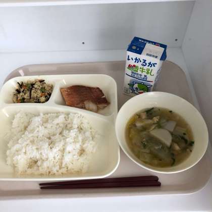 今日の献立は、ご飯、牛乳、赤魚のしょうゆだれかけ、うすくず汁、高野豆腐のいり煮でした。