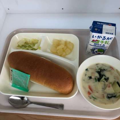 今日の献立は、コッペパン、牛乳、ほうれん草のクリームシチュー、キャベツのサラダ、洋梨の缶詰、りんごジャムでした。