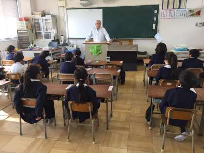1年生の教室で空気検査を行いました。学校薬剤師の先生が来られました。「教室でみんなが勉強するのにいい空気か検査をします。」と話をしてくれました。検査の結果は問題はなかったようです。