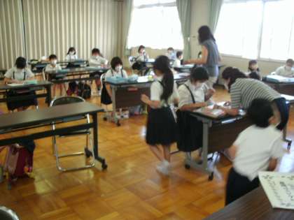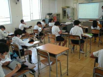 2年生、3年生、5年生の様子です。お子様はお友達との距離を作りながら、先生の説明を聞いています。3年生は人数のことから多目的室を使っています。5年生はタブレットを使っています。