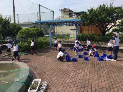 今日はとても天気が良く、気候も暑かったです。子どもたちは元気です。1時間目に3年生が体育の授業を行いました。久しぶりの運動場での授業です。体育の授業ではマスクを外し、距離を取っての活動です。1年生は生活科の授業です。あさがおの種を植えています。どんな風に育つかな?楽しみですね。
