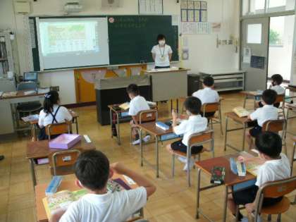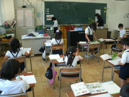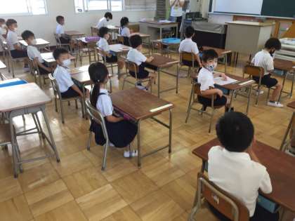 今日も元気に登校してくれています。月曜日なので、本来なら運動場で児童朝会の予定だったのですが、暑さと3密を防ぐことから放送での朝会となりました。校長先生から来週から通常に戻る話がありました。いよいよ6時間授業復活です。1年生は校長先生の話を聞く態度も授業を受ける態度も良かったです。2年生は生活科の授業です。何の葉っぱでしょうか。
