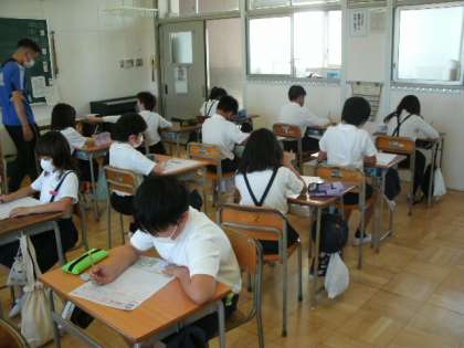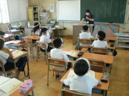 4年生は道徳の授業です。話合いがあるため、フェイスシールドを使用しています。5年生はテストをしています。真剣です。