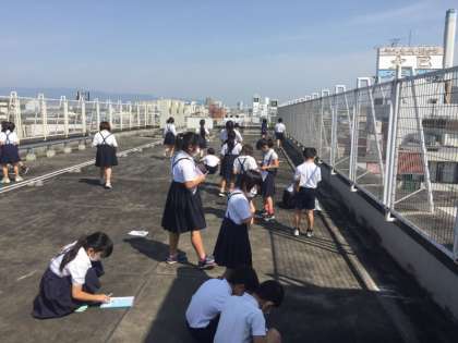 さて、今日の3年生の社会の授業の様子です。方位磁石で北の調べ方を確認してから、学校の屋上から福町を調べました。普段入らない場所なので、とても慎重でしたが、調べるのは一生懸命でした。自分の家がどこにあるか、普段見るお店や建物をお友達と調べました。授業の最後に、お友達とどの方角に何があるか確認しました。ご家庭でもお子様に聞いてみてください。
