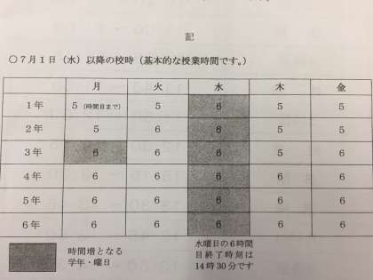 6月15日より、通常の教育活動を再開いたしましたが、児童の学習の授業時間を保障するため、夏季休業の短縮と共に、7月1日(水)より下記の画像の通り授業時数を増やすこととなりました。水曜日につきましては、下校時刻があまり変わらないように校時を40分授業の6校時(6時間目終了14時30分)といたします。特に授業時数が不足する3年生につきましては、月曜日の6時間目も授業とし時数を確保いたします。