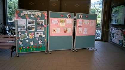 4月に準備していた物もリニューアルして準備をしました。新しく作り直したものもあります。左の「ハッピーブックちゃん」は本校の保護者の方の図書ボランティアです。メンバー募集しております。興味があれば、ぜひご連絡ください。祝電もたくさんいただいています。
