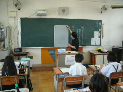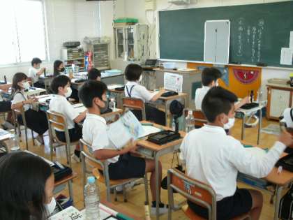 5年生は習字の授業です。丁寧に書いています。シャツに、墨汁つけなや!