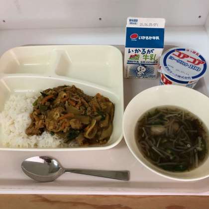 今日の献立は、牛乳、和風カレー丼、もずくとオクラのとろり汁、ヨーグルトでした。