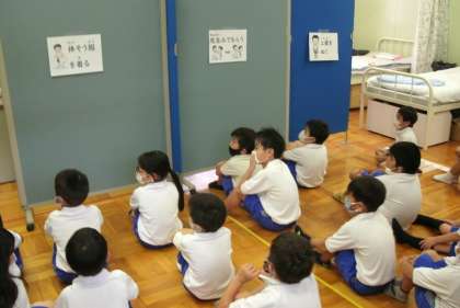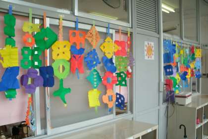 1年生は5時間目に発育測定を行いました。学校医の先生に来ていただきました。先生が待っている間、1年生はマイペースで保健室へ。保健室へ帰ったらみんな静かに診察を受けました。下の写真は、1年生が「ちょきちょき かざり」で作りました。教室の横に飾っています。
