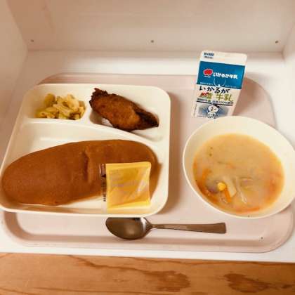 今日の献立は、コッペパン、牛乳、サーモンフライ、豆乳スープ、キャベツのカレーソテー、アプリコットジャムでした。