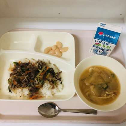 今日の献立は、牛乳、牛丼、とうがんのみそ汁、大福豆の煮物でした。