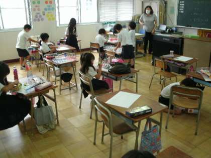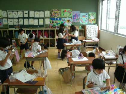 2年生の図工の授業です。お家で集めてもらったペットボトルや卵のケースに着色したり、デコレーションしています。集中しています。