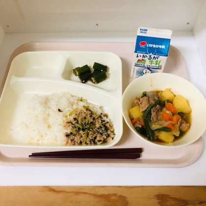 今日の献立は、ご飯、牛乳、豚肉とじゃがいもの煮物、オクラの梅風味、ツナッ葉いためでした。