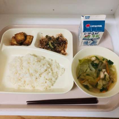 今日の献立は、ご飯、牛乳、ゴーヤチャンプルー、すまし汁、あつあげのしょうがじょうゆかけでした。