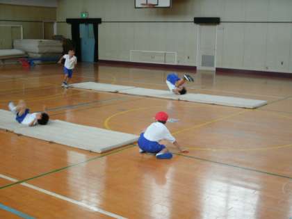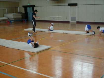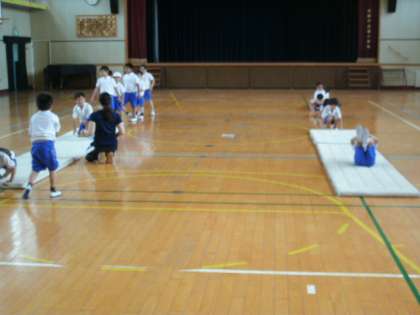 1年生の体育の授業です。雨のため、講堂で行っています。マット運動です。上手に回っています。早くしたくて、前の人のすぐ後ろで待っています。