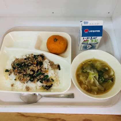 今日の献立は、牛乳、豚ミンチとニラのそぼろ丼、オクラのみそ汁、冷凍みかんでした。