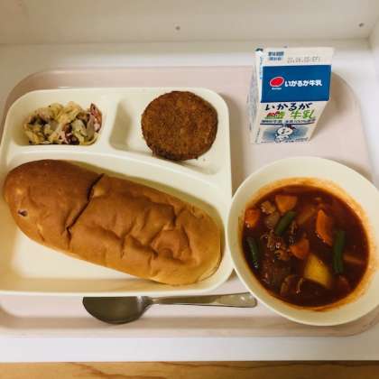 今日の献立は、おさつパン、牛乳、チキンレバーカツ、ケチャップ煮、たことキャベツのバジルソテーでした。