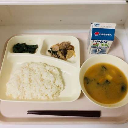 今日の献立は、ご飯、牛乳、豚肉のしょうが焼き、みそ汁、三度豆のごまあえでした。