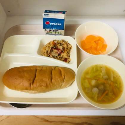 今日の献立は、黒糖パン、パエリア、ウインナーとキャベツのスープ、みかん缶でした。