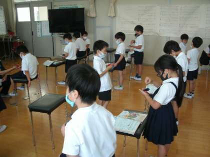 1年生の音楽の様子です。曲に合わせてカスタネットでリズムを取っています。かわいらしいです。