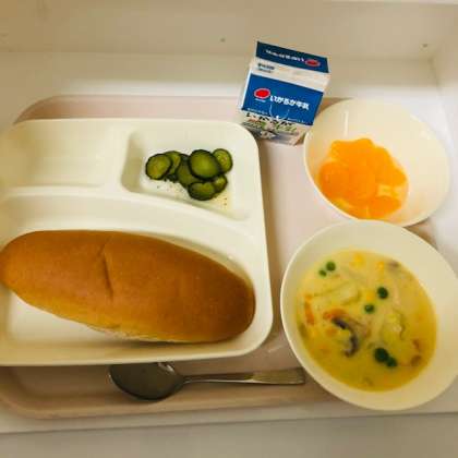 今日の献立は、黒糖パン、牛乳、コーンクリームシチュー、きゅうりのバジル風味サラダ、みかん缶でした。