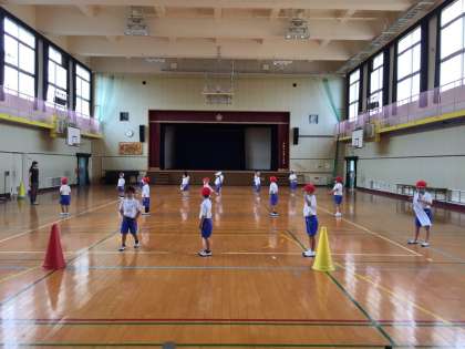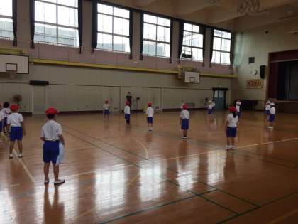 1年生の体育の時間です。雨のため、講堂で運動会の練習をしています。初めての運動会の練習なので、ためらいもあるようです。