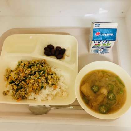 今日の献立は、牛乳、他人丼、冬瓜のみそ汁、金時豆の煮ものでした。