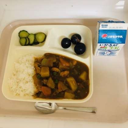 今日の献立は、牛乳、チキンカレーライス、きゅうりのピクルス、ぶどう(巨峰)でした。