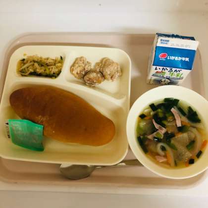 今日の献立は、コッペパン、牛乳、鶏肉のからあげ、冬瓜の中華スープ、切干大根のごま辛みづけ、りんごジャムでした。