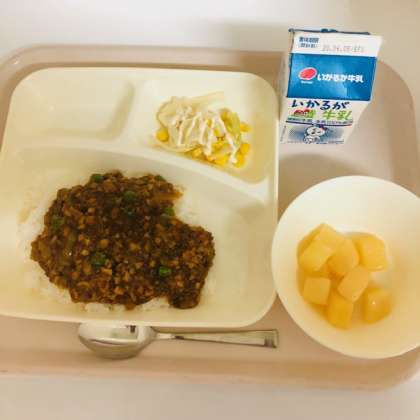 今日の献立は、牛乳、大豆入りキーマカレーライス、キャベツとコーンのサラダ、白桃(カット缶)でした。