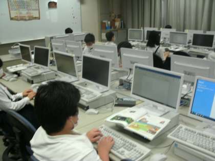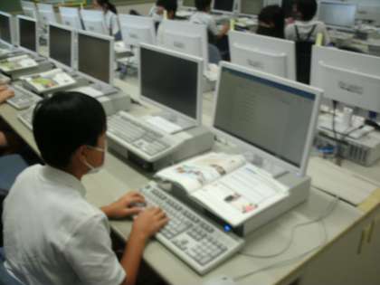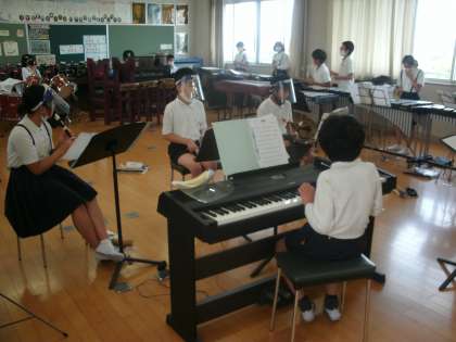 6年生の授業です。英語の授業です。教科書の文章をパソコンでタイピングしています。音楽の授業です。「紅蓮華」を練習しています。