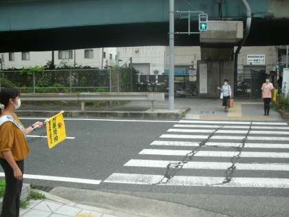 PTAの皆さんには立哨でご協力いただいています。国道43号線、阪神電車の踏切の所で、お家の方に見守りをローテーションを組んでしていただいています。朝のお忙しい中、ありがとうございます。