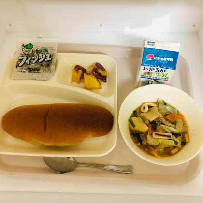 今日の献立は、黒糖パン、牛乳、豚肉といかの中華煮、大学いも、ミニフィッシュでした。