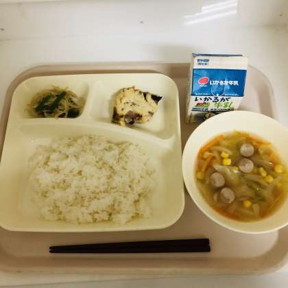 今日の献立は、ご飯、牛乳、かつおのマリネ焼き、ウインナーと野菜のスープ、もやしとピーマンのソテーでした。